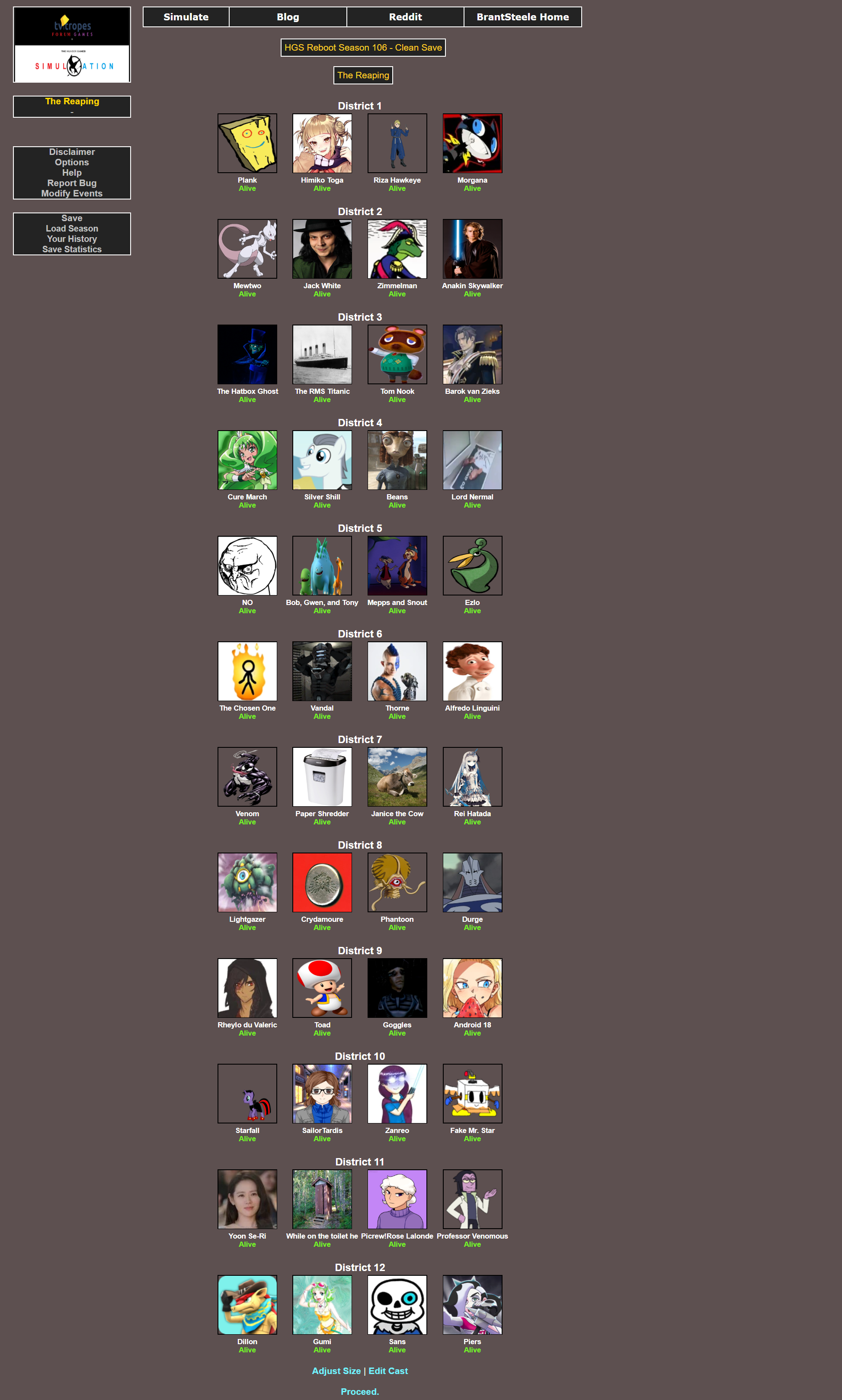 Reboot Season 106 is the 106th season of Hunger Games Simulator: Beyond the Possibilities, the 356th season overall, and the third Reboot Death Battle. It was run by Scipion3 and hosted by Billy5545, from 16th June to 18th June, 2020. It featured 48 tributes from 28 nominators, as well as 46 different works.