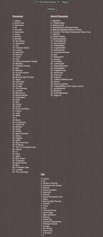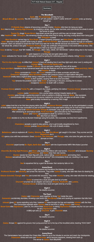 Reboot Season 317 is the 317th season of Hunger Games Simulator: Beyond the Possibilities, the 567th season overall. It was run by DubhKafkaesque and hosted by NineTailedCat from 17th to 18th March, 2024. It featured 68 tributes from 34 nominators, as well as (worknumber) different works. This season featured the debut of Scholarworld.