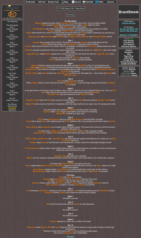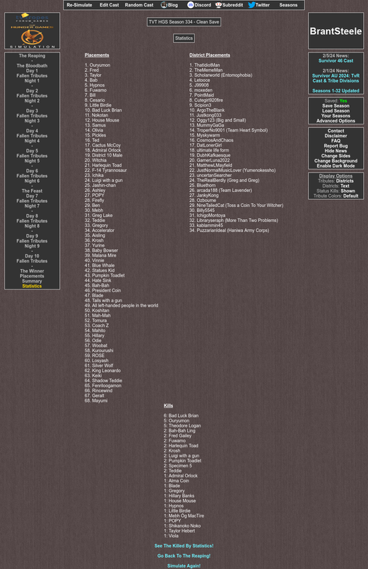 Reboot Season 334 is the 334th season of Hunger Games Simulator: Beyond the Possibilities and the 584th season overall. It was run by NineTailedCat and hosted by Cutegirl920fire from 14th to 20th August, 2024. It featured 68 tributes from 34 nominators, as well as 44 different works.