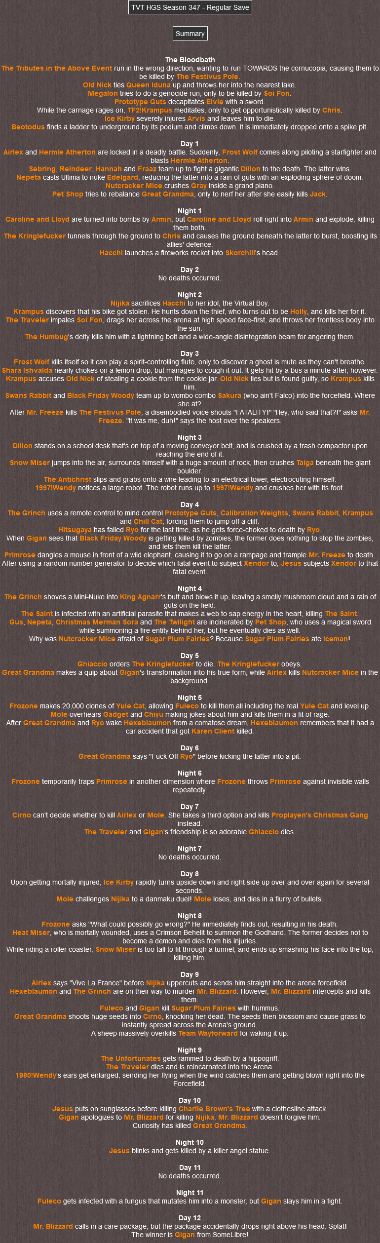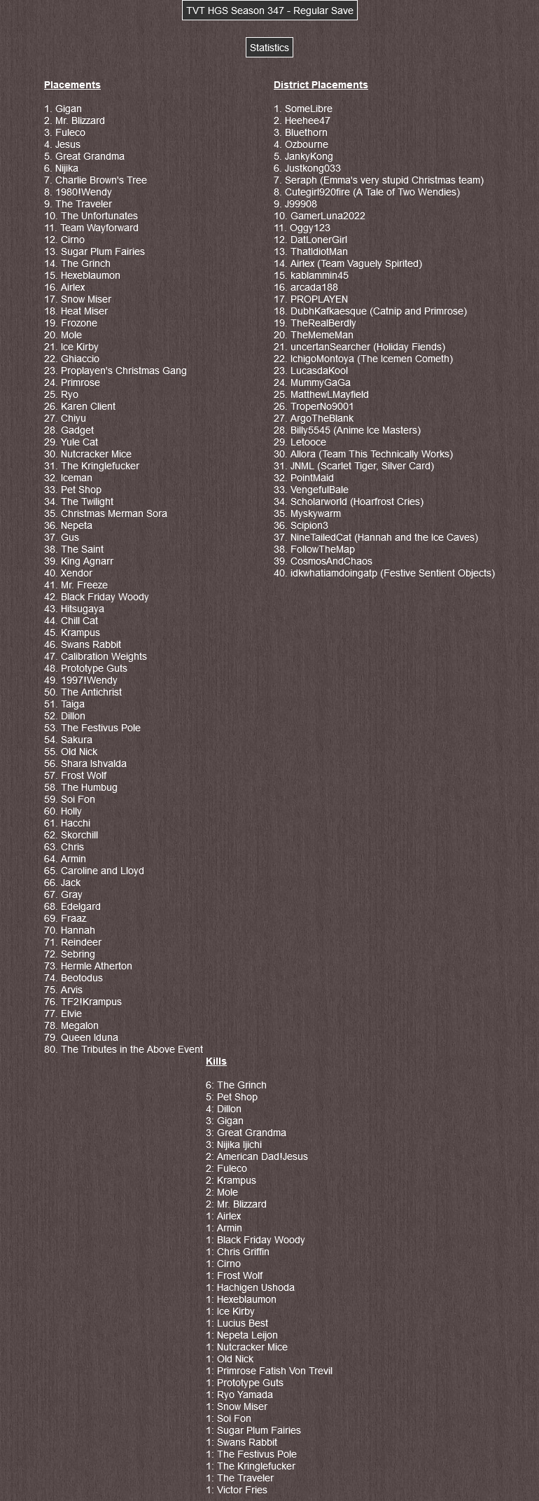 Reboot Season 347 is the 347th season of Hunger Games Simulator: Beyond the Possibilities, the 597th season overall and the seventh Reboot Christmas Episode. It was run by DubhKafkaesque and hosted by kablammin45 from 25th to 29th December, 2024. It featured 80 tributes from 40 nominators, as well as (worknumber) different works. (Note:optional) This season featured the debut of (newbie).