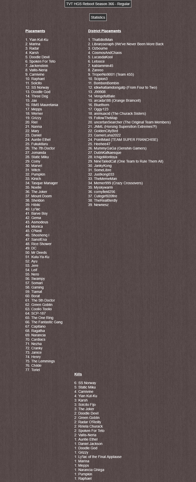 Reboot Season 366 is the 366th season of Hunger Games Simulator: Beyond the Possibilities and the 616th season overall. It was run by DubhKafkaesque and hosted by moxeden from 23rd August to 2nd September, 2025. It featured 77 tributes from 39 nominators, as well as (worknumber) different works. This season featured the debut of animuacid and Newnesz.