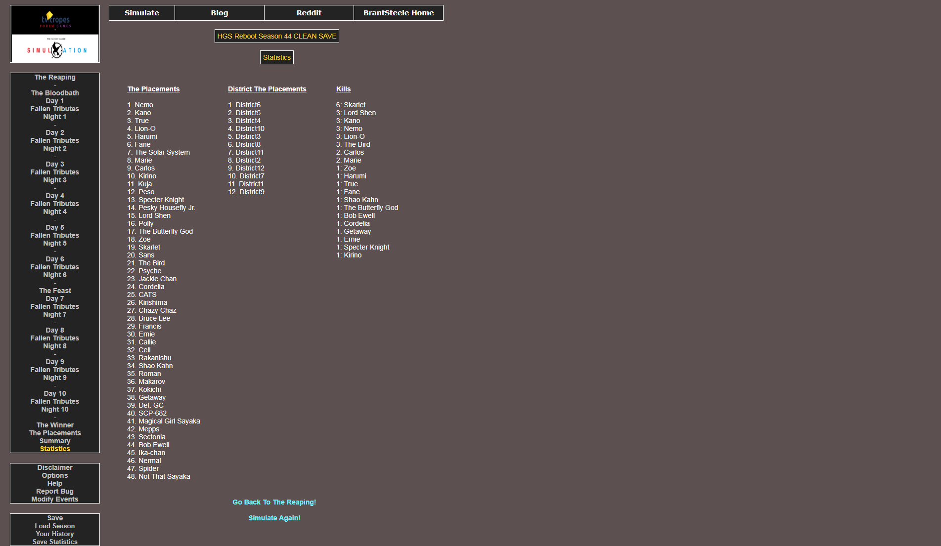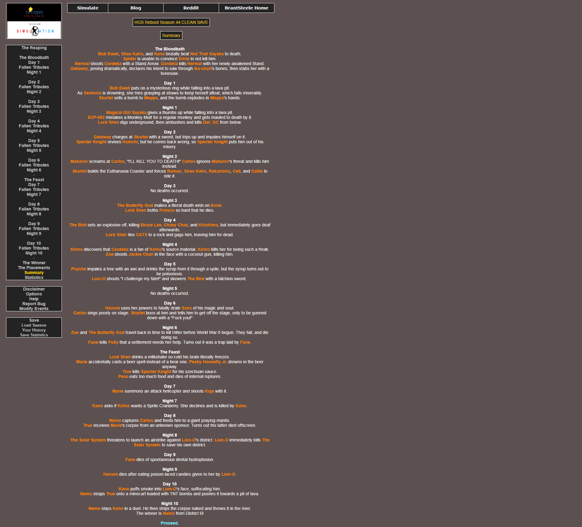 Reboot Season 44 is the 44th season of Hunger Games Simulator: Beyond the Possibilities, the 294th season overall, and the third OG Anniversary. It was run by dave_the_assassin and hosted by TheMemeMan from 24th to 28th May, 2019. It featured 48 tributes from 24 nominators, as well as TBA different works.